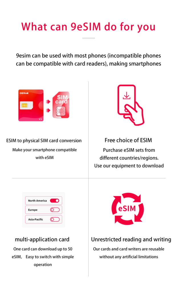 | Why do I need the Card Reader? | Some phones lack the hardware to “write” data directly to the 9esim card. The reader acts as a bridge to manage and switch profiles via a PC or external connection. |
